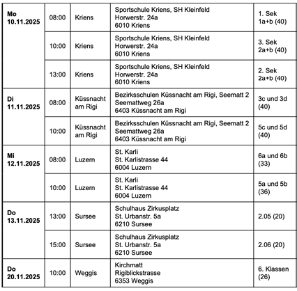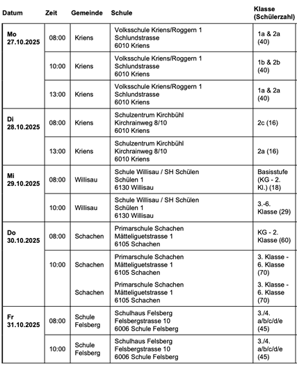 30. 4. 25 in Altenrhein 12. 5. 25 in Rorschacherberg 13. 5. 25 in Niederteufen 14. 5. 25 in Glarus 15. 5. 25 in Horn 16. 5. 25 in Rheineck 26. 5. 25 in Amriswil 27. 5. 25 in Sevelen 28. 5. 25 in Riedern